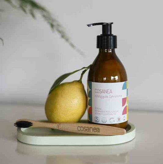 Zahncreme Zitrone-Ratanhiawurzel-Nelke (fluoridhaltig), Starterset (Glasflasche + Pumpspender), 250 ml