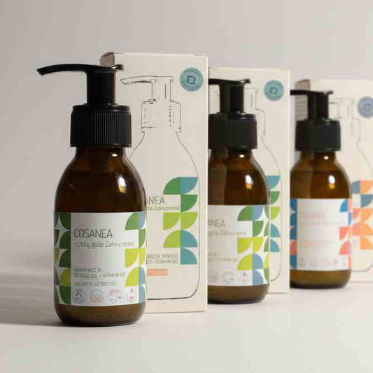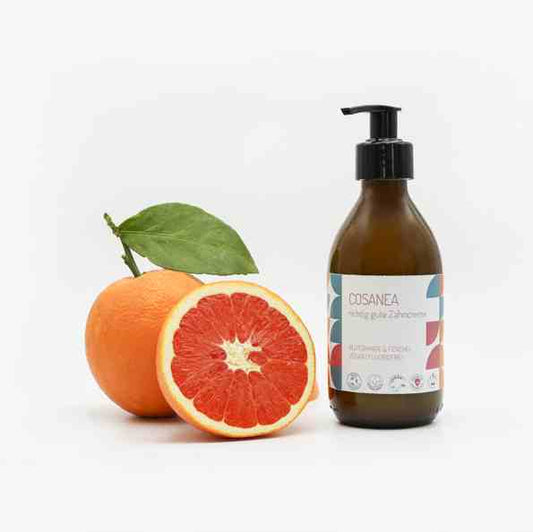 Zahncreme Blutorange-Fenchel (fluoridfrei), Starterset (Glasflasche + Pumpspender), 250 ml