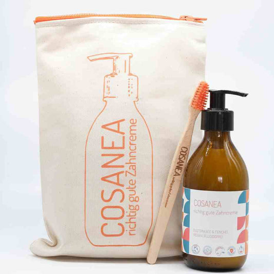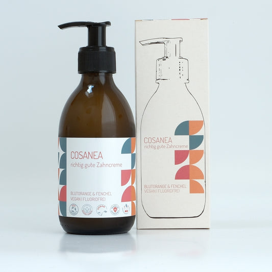 toothpaste Blood Orange-Fennel (fluoride free), starter set (glass bottle + dispenser), 250ml