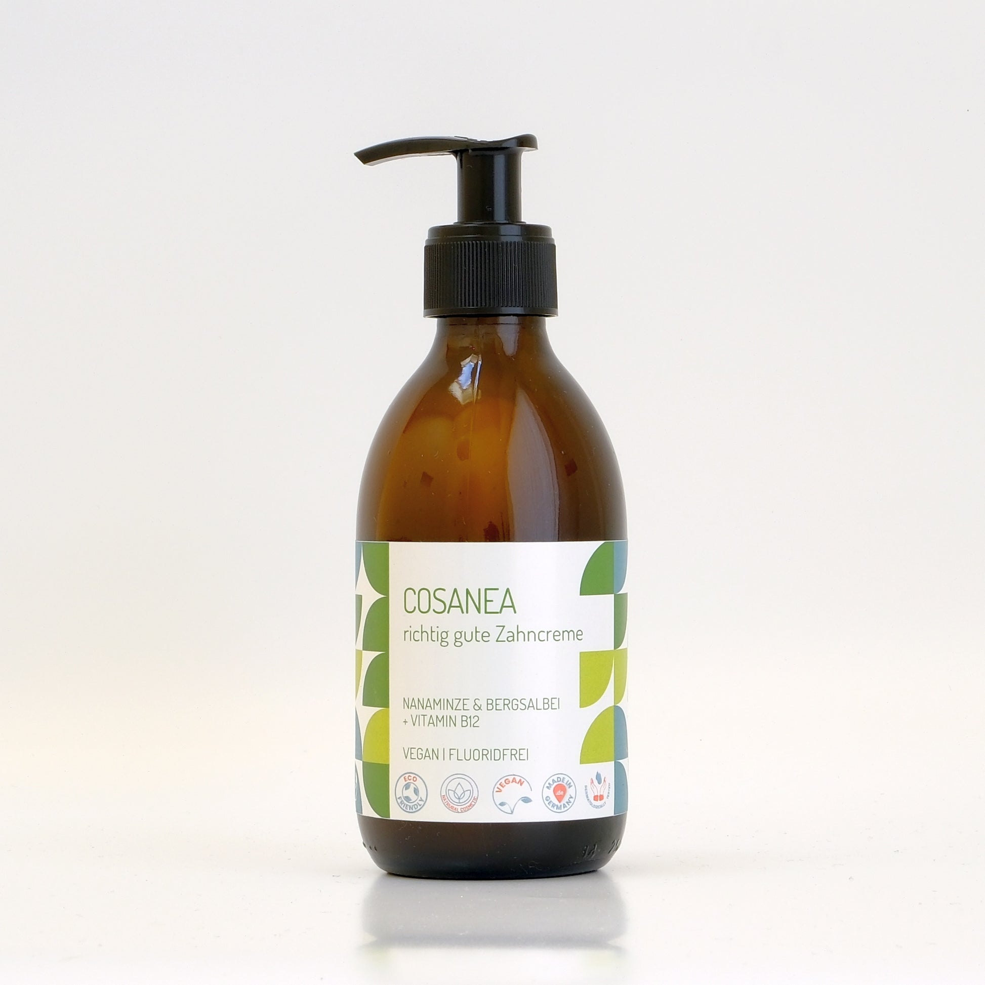 Zahncreme Marokkanische Minze-Bergsalbei + Vitamin B12 (fluoridfrei), Starterset (Glasflasche + Pumpspender), 250 ml
