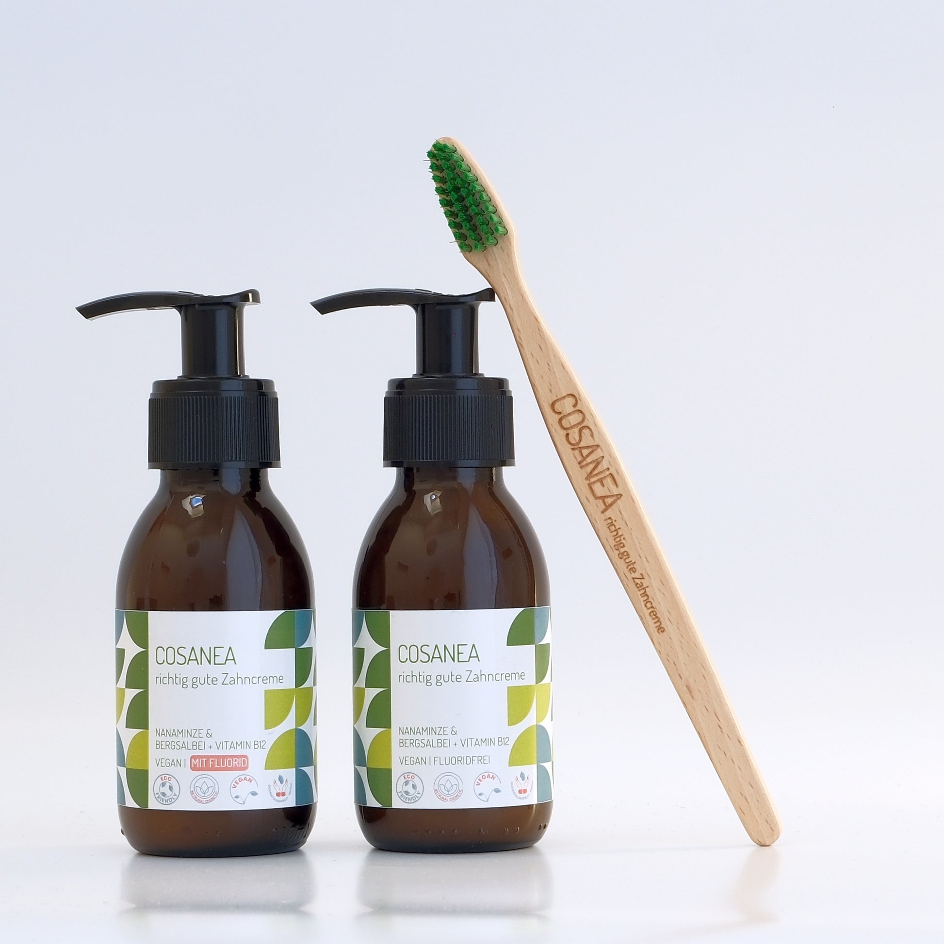 Zahncreme Marokkanische Minze + Vitamin B12 (fluoridhaltig), Reisegröße (Glasflasche + Pumpspender), 90 ml